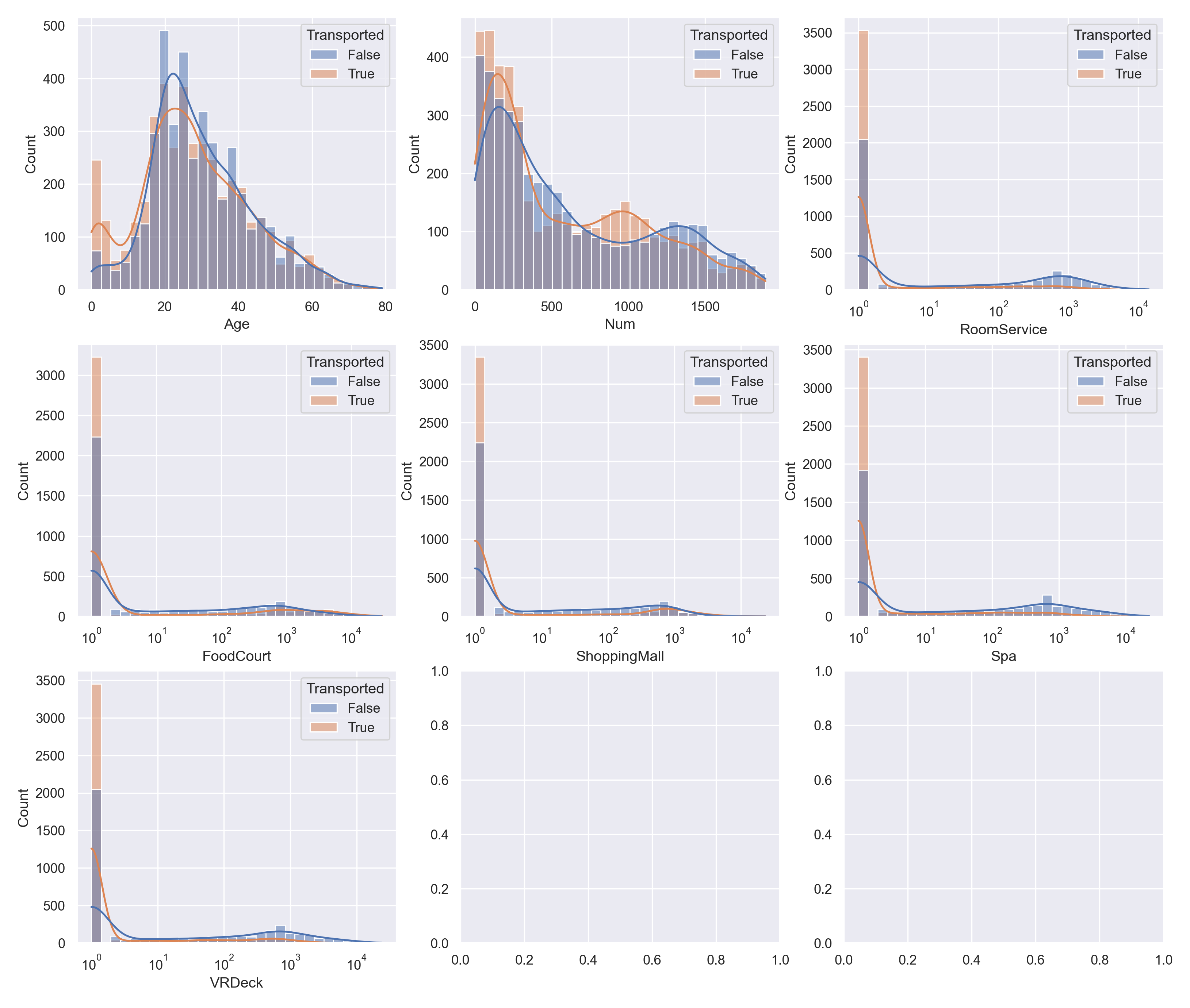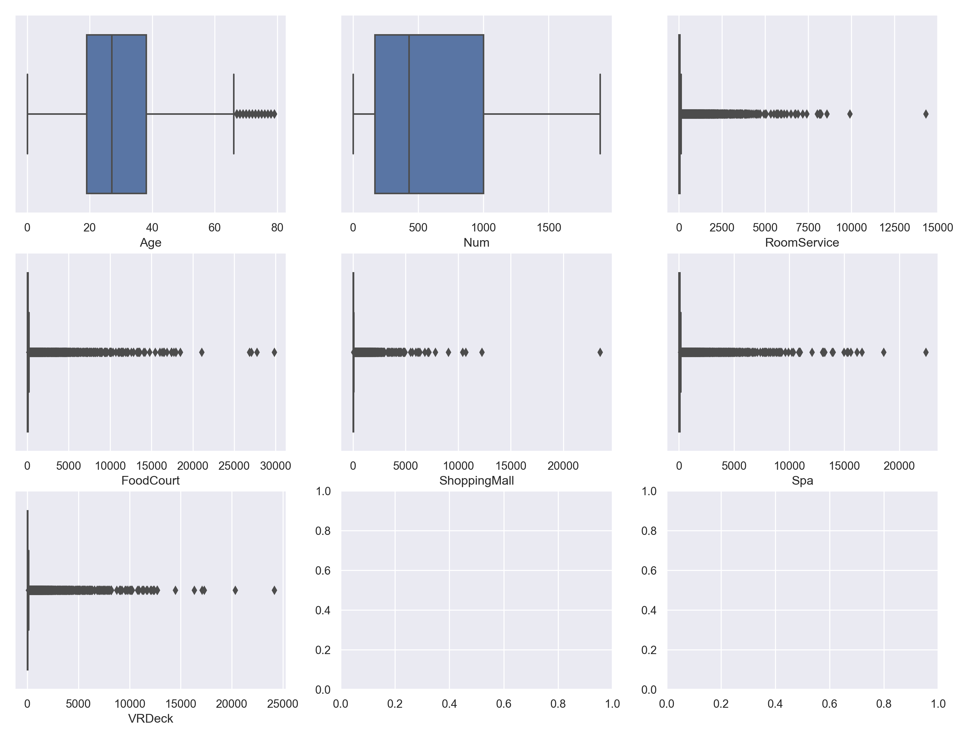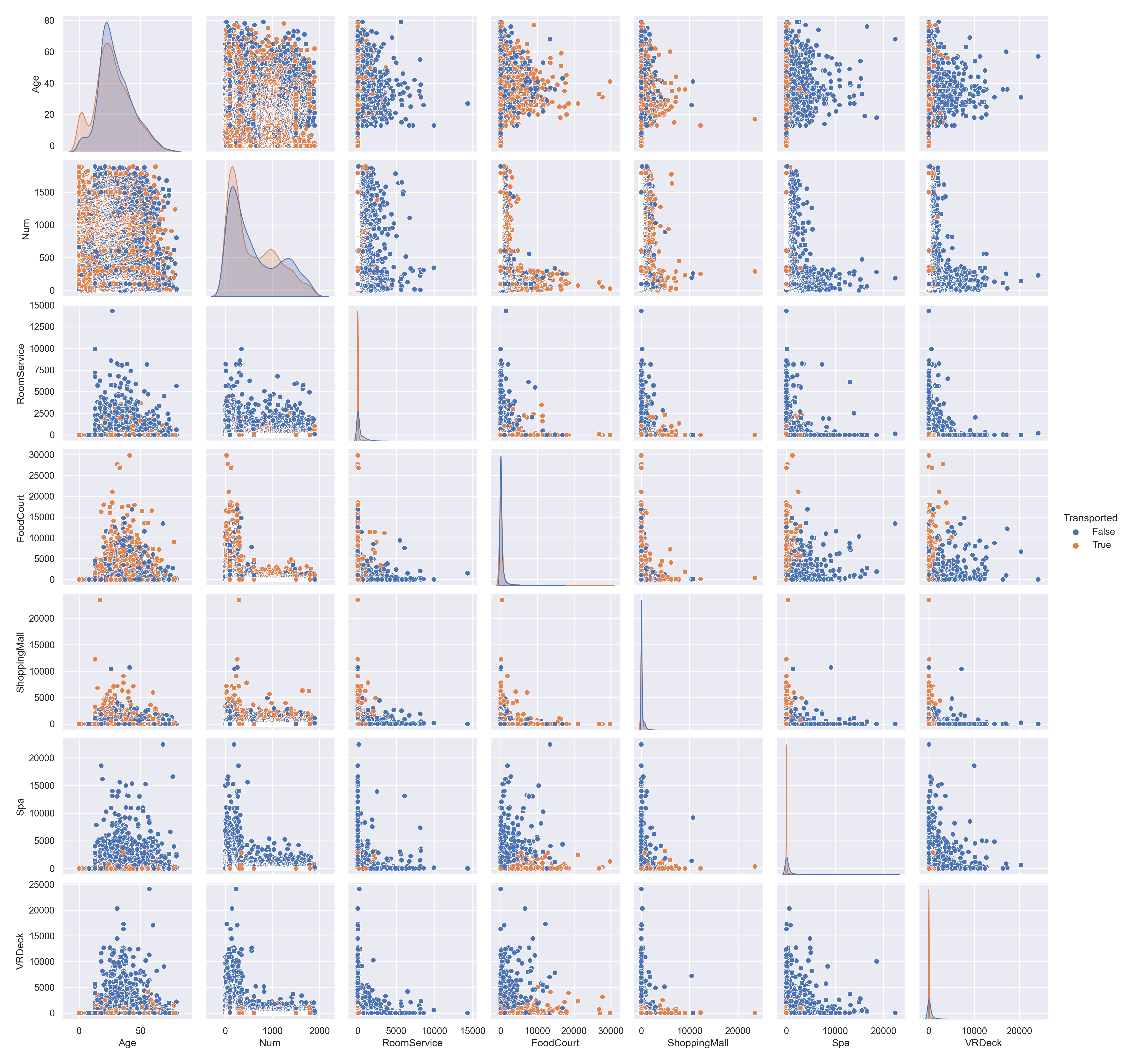 columns=['Age', 'Num', 'RoomService', 'FoodCourt', 'ShoppingMall', 'Spa', 'VRDeck']