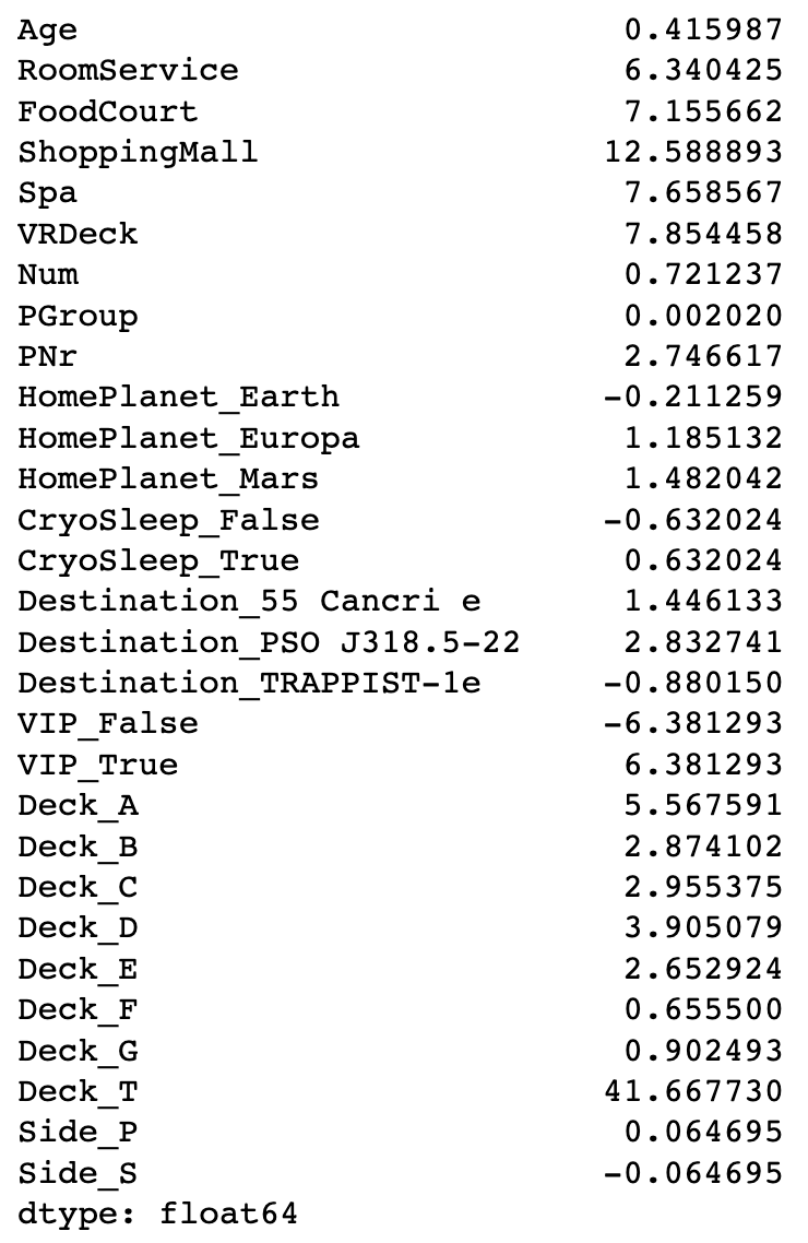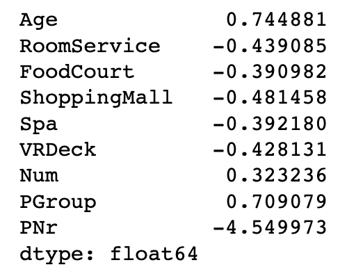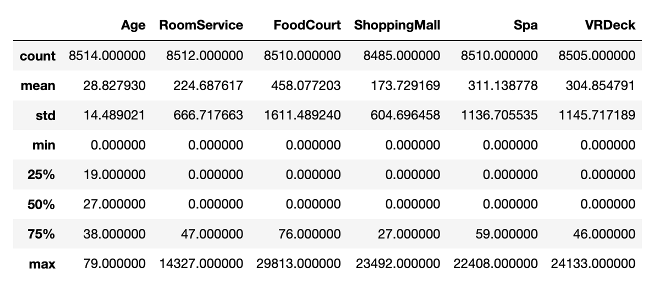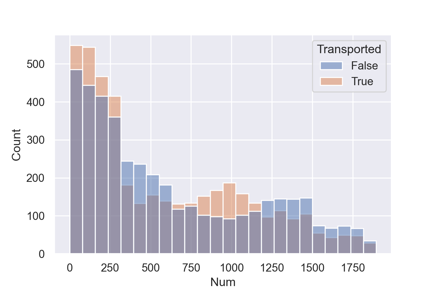 columns=['Age', 'Num', 'RoomService', 'FoodCourt', 'ShoppingMall', 'Spa', 'VRDeck']