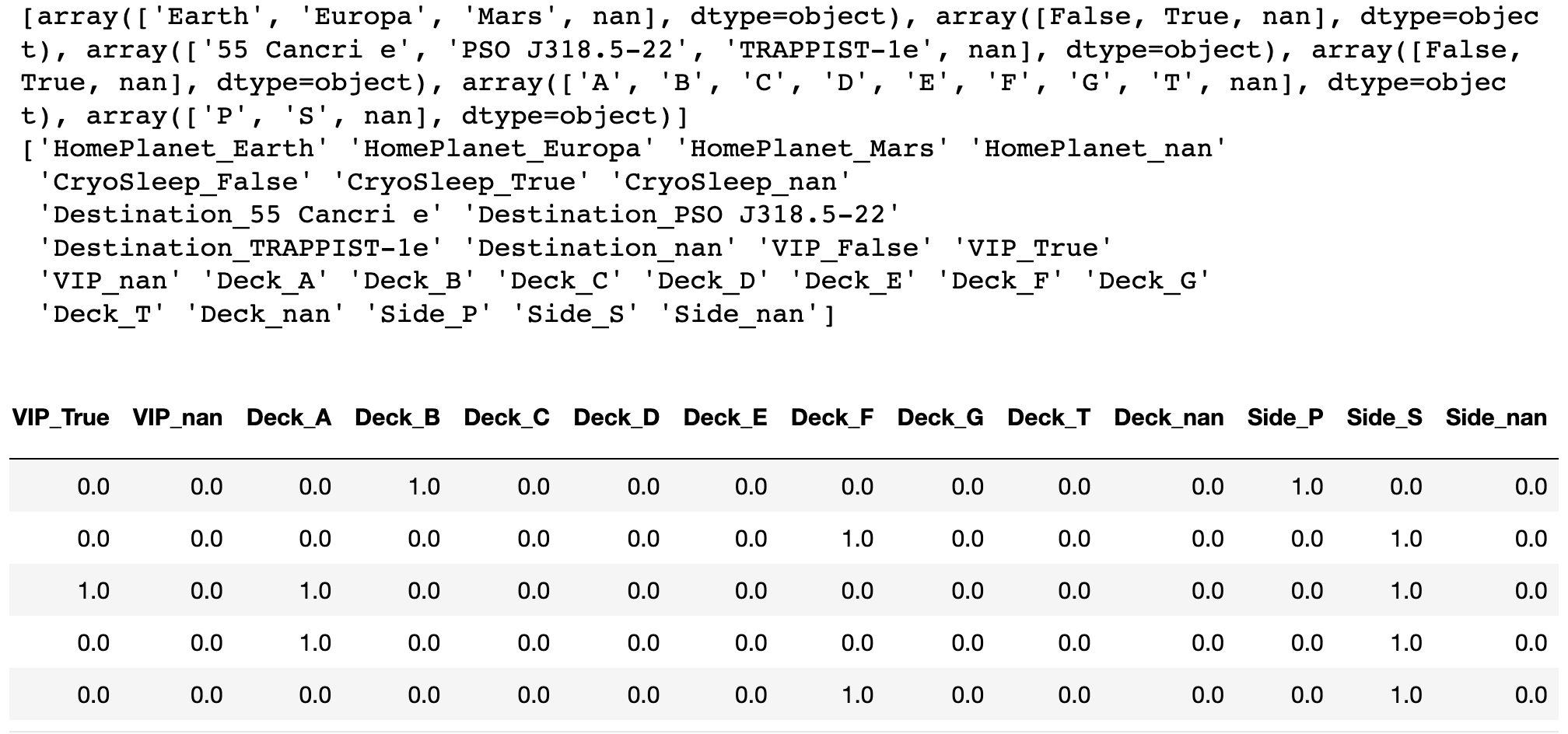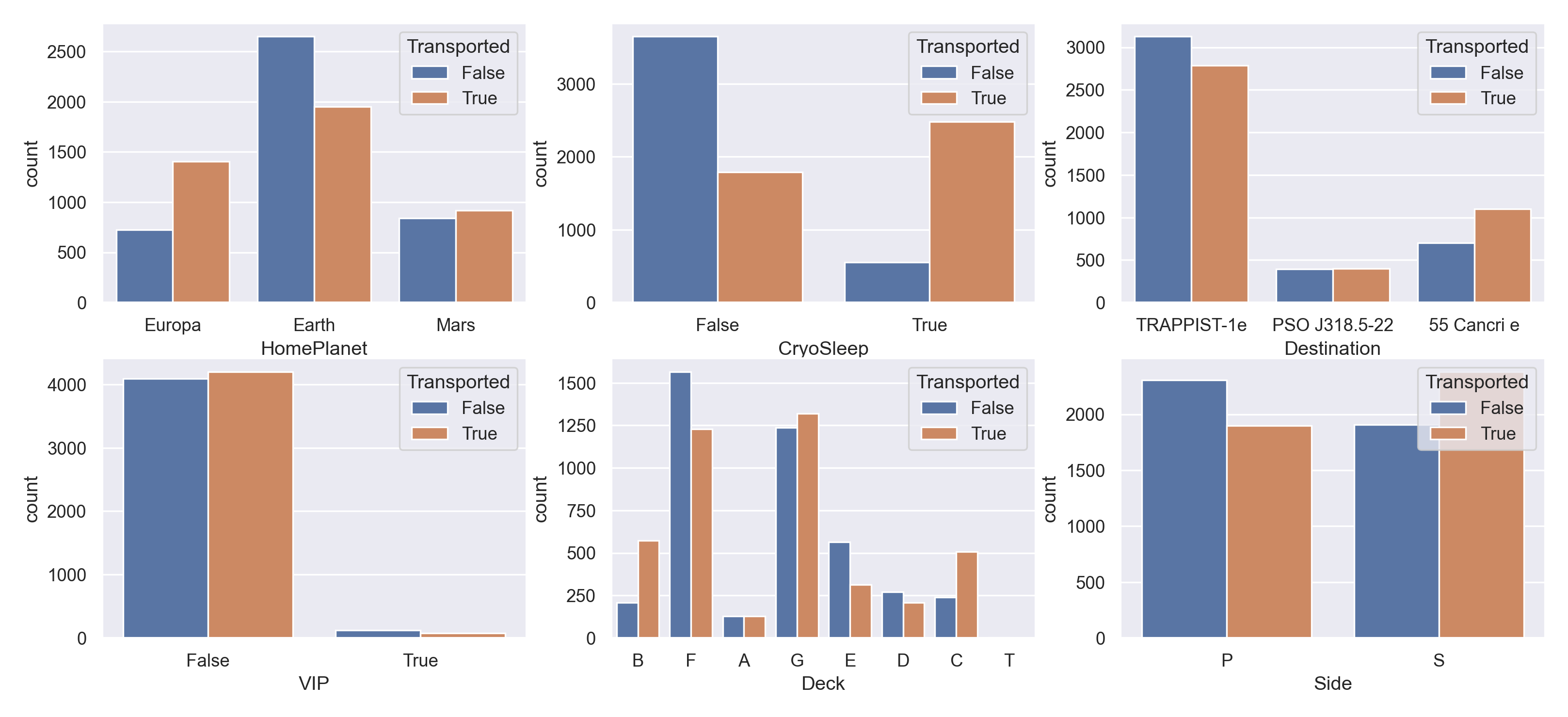 df = train_data[['HomePlanet', 'CryoSleep', 'Destination', 'VIP', 'Deck', 'Side']].copy()
