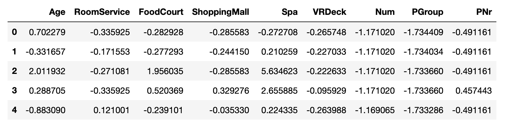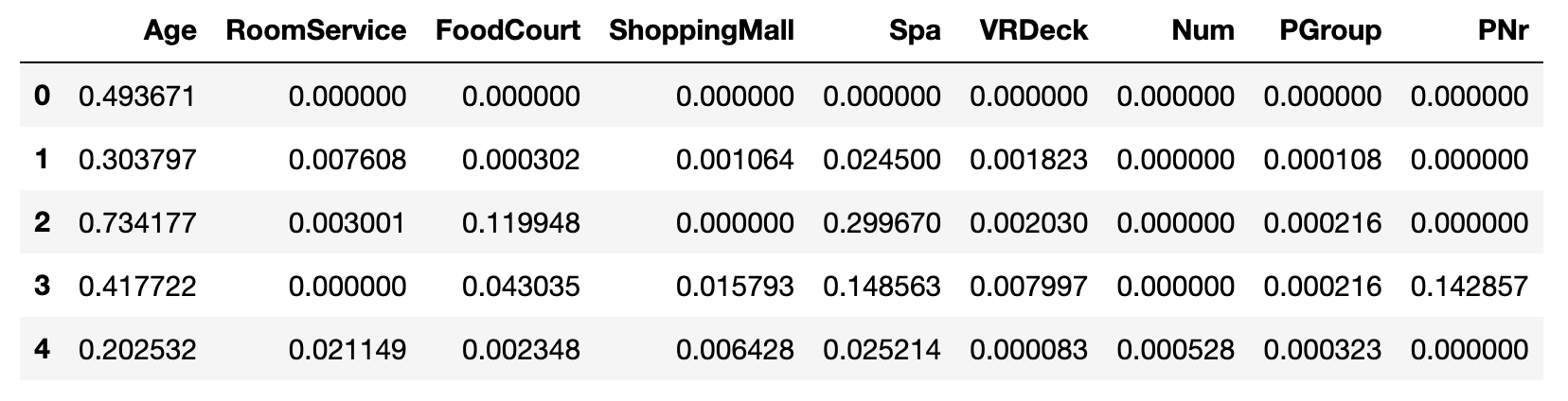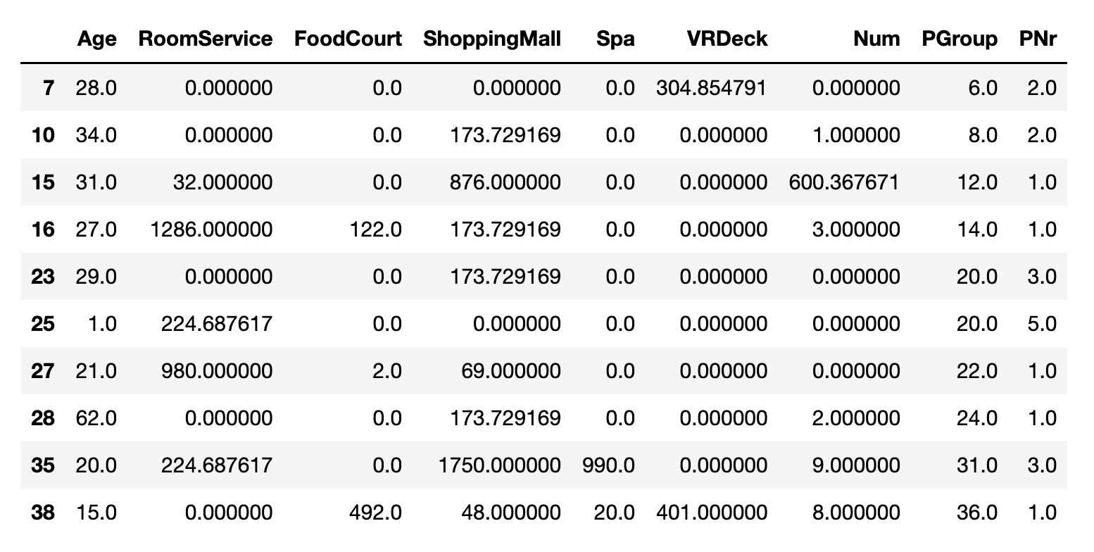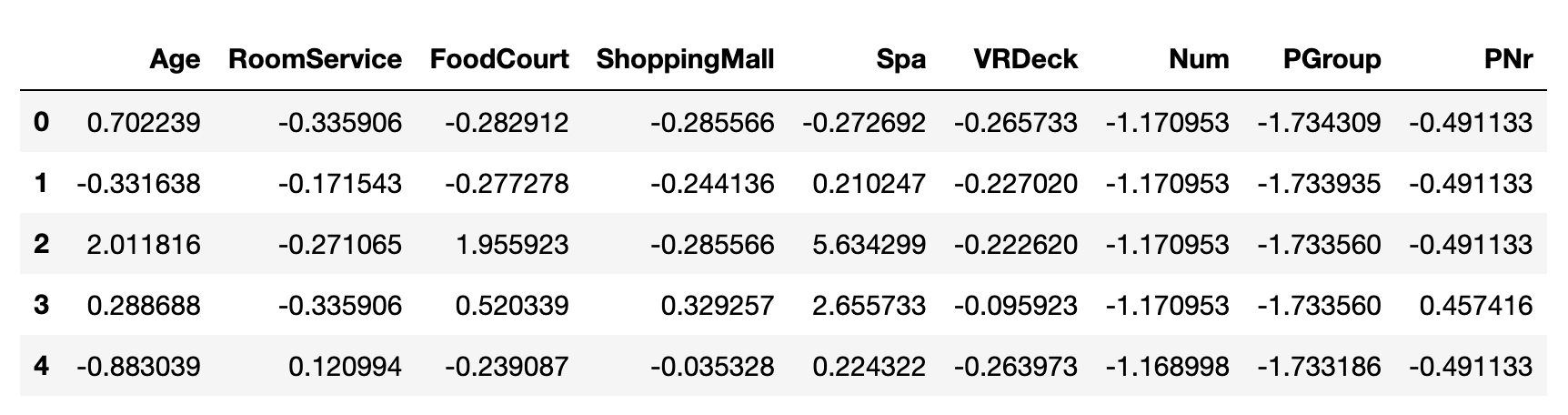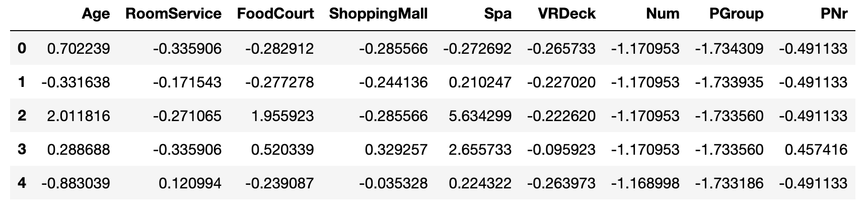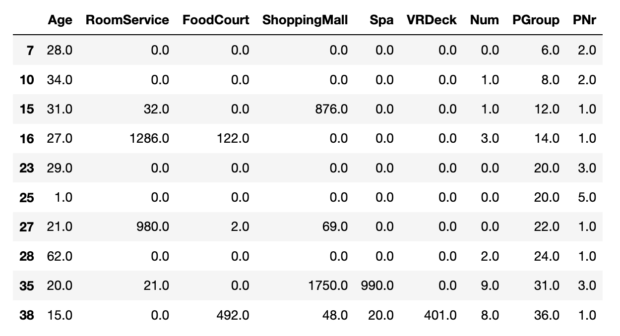 df_tmp = df[['Age', 'RoomService', 'FoodCourt', 'ShoppingMall', 'Spa', 'VRDeck', 'Num', 'PGroup', 'PNr']].copy()