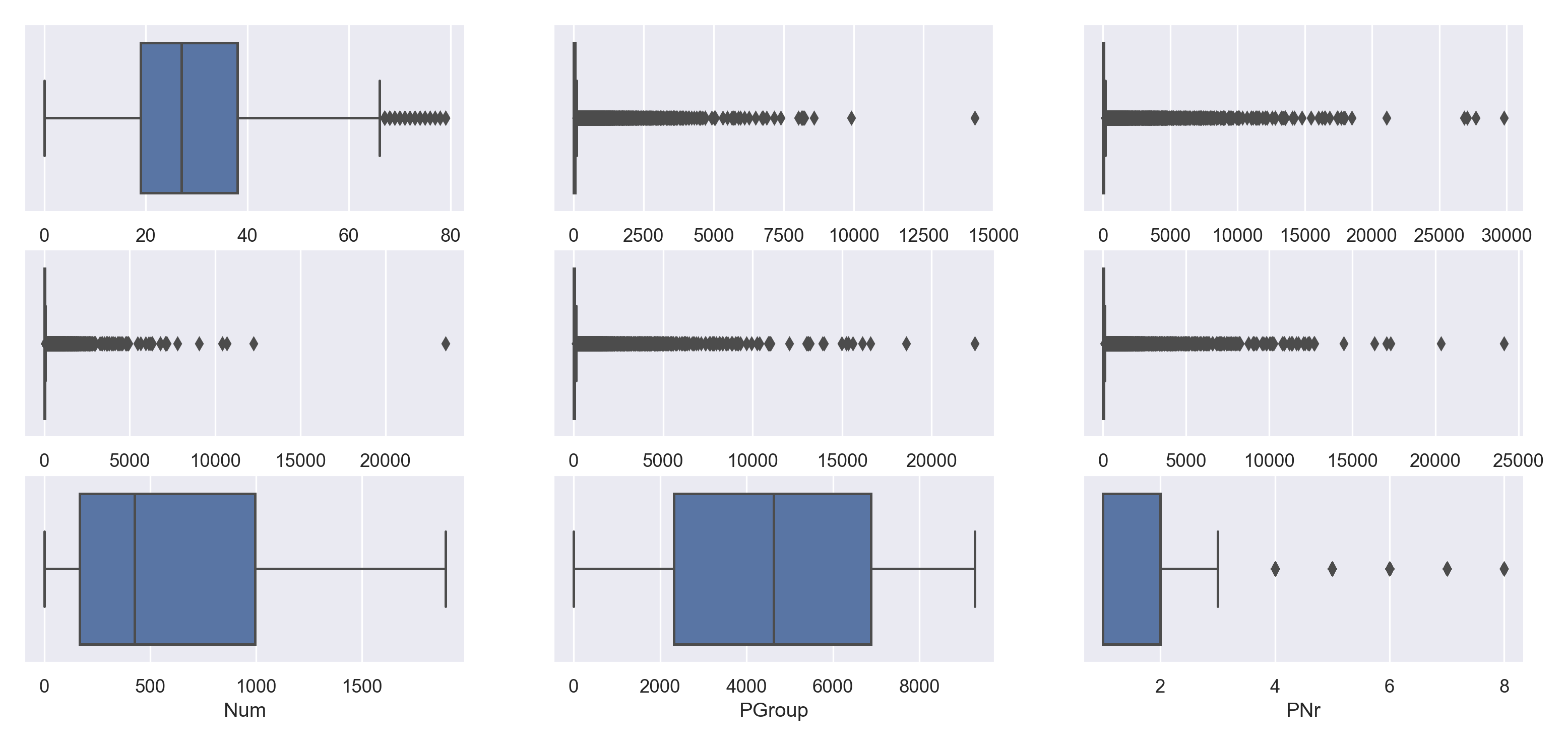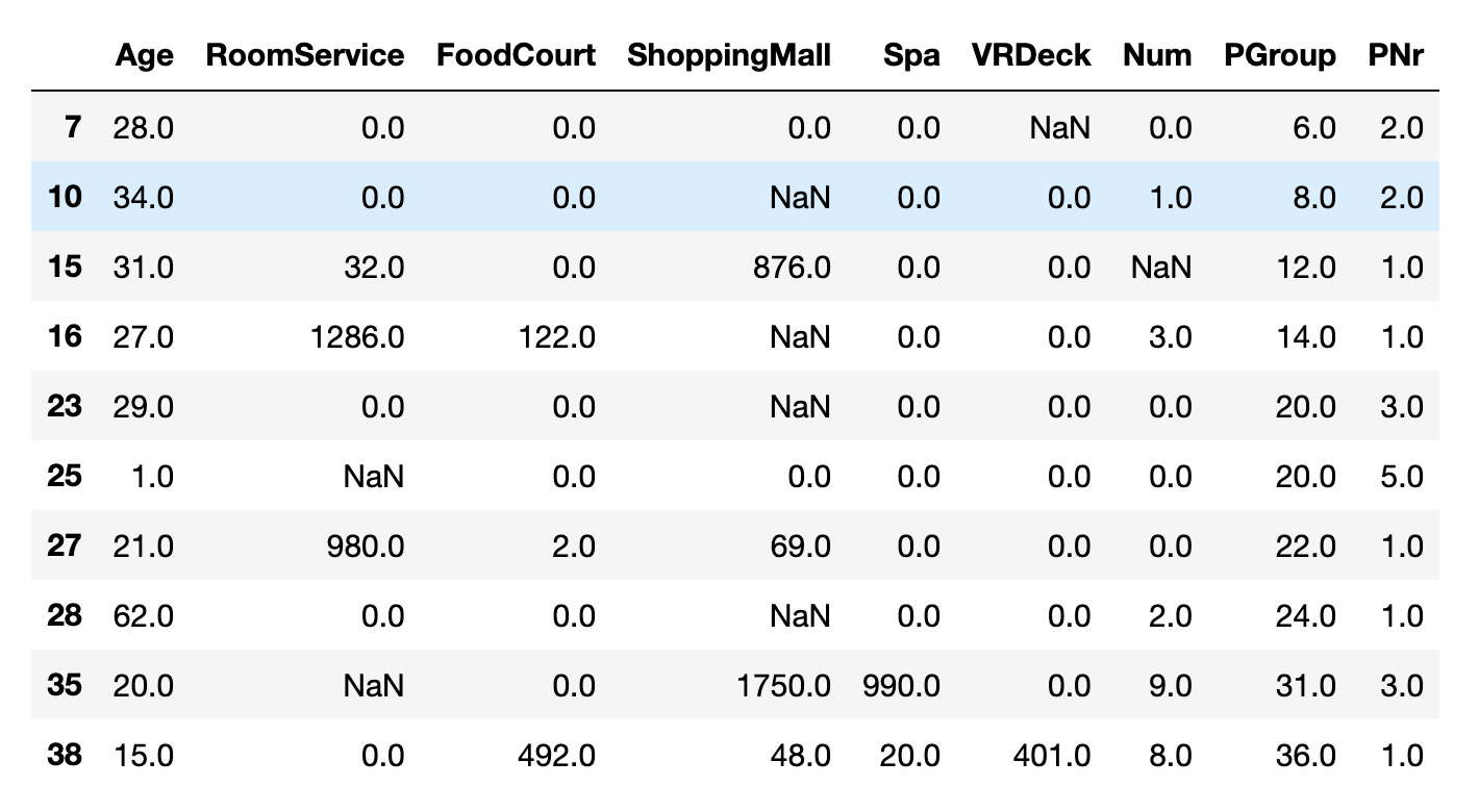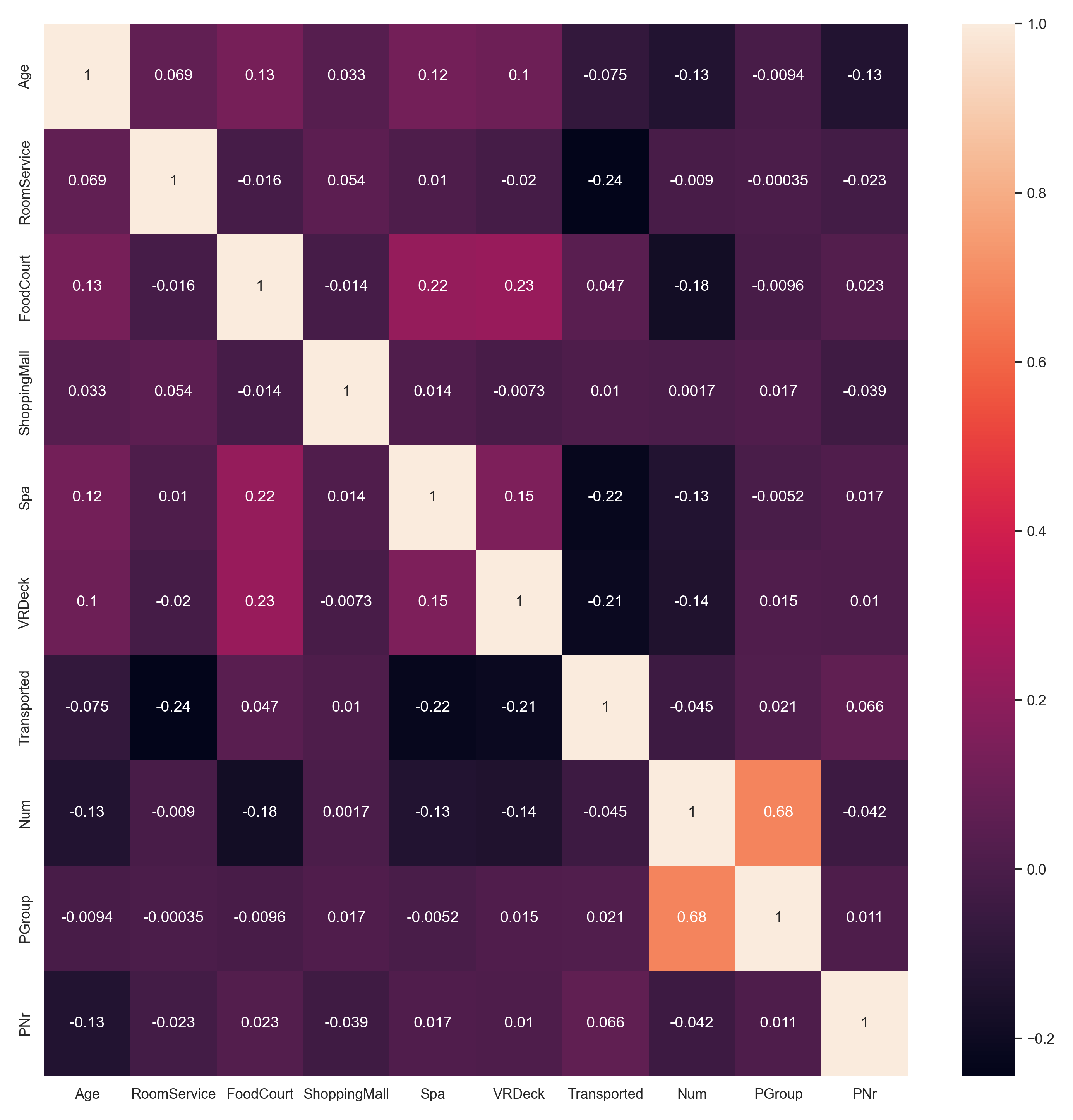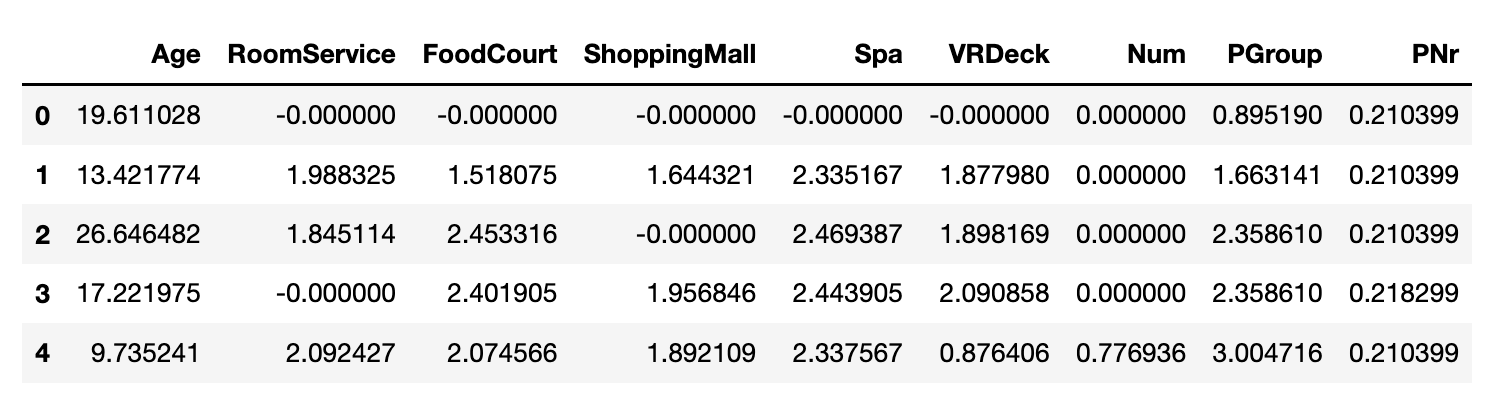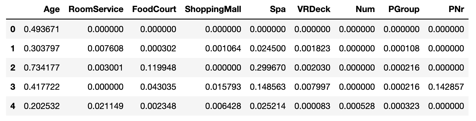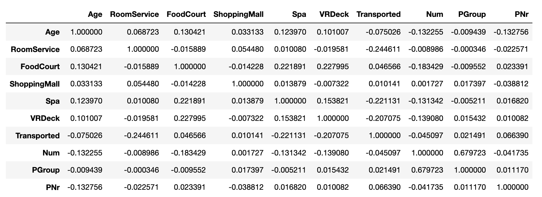 df_tmp = df[['Age', 'RoomService', 'FoodCourt', 'ShoppingMall', 'Spa', 'VRDeck', 'Num', 'PGroup', 'PNr']].copy()