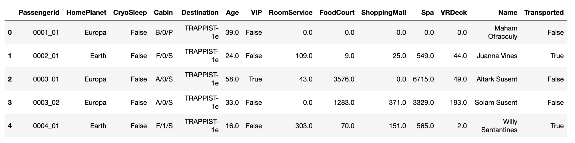 - Transported - Whether the passenger was transported to another dimension. This is the target, the column you are trying to predict.