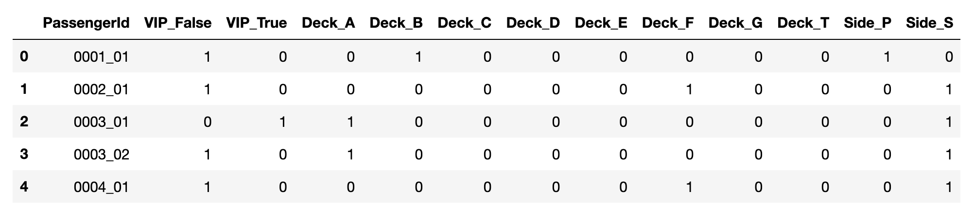 df = pd.get_dummies(df, columns=['HomePlanet', 'CryoSleep', 'Destination', 'VIP', 'Deck', 'Side'])