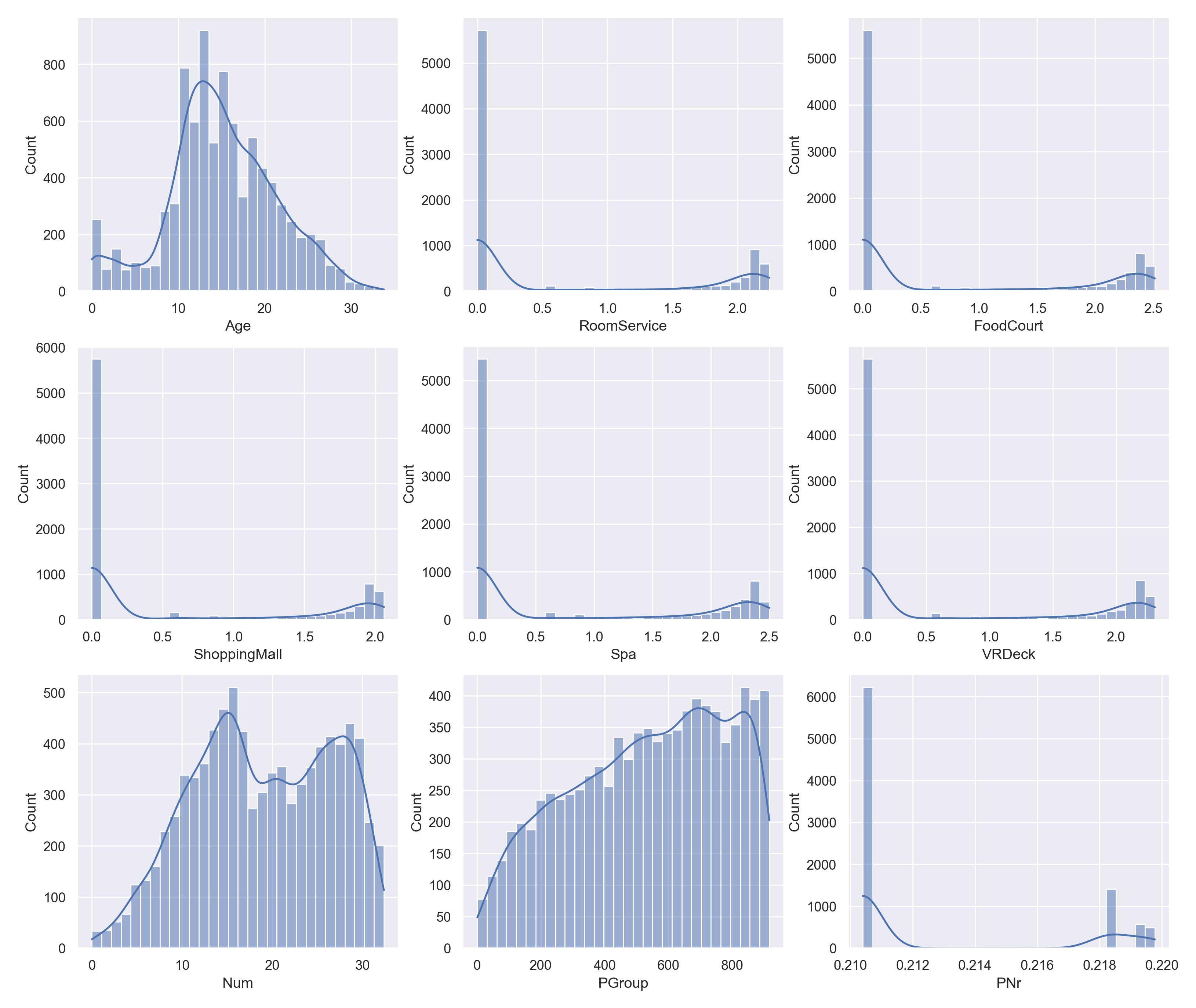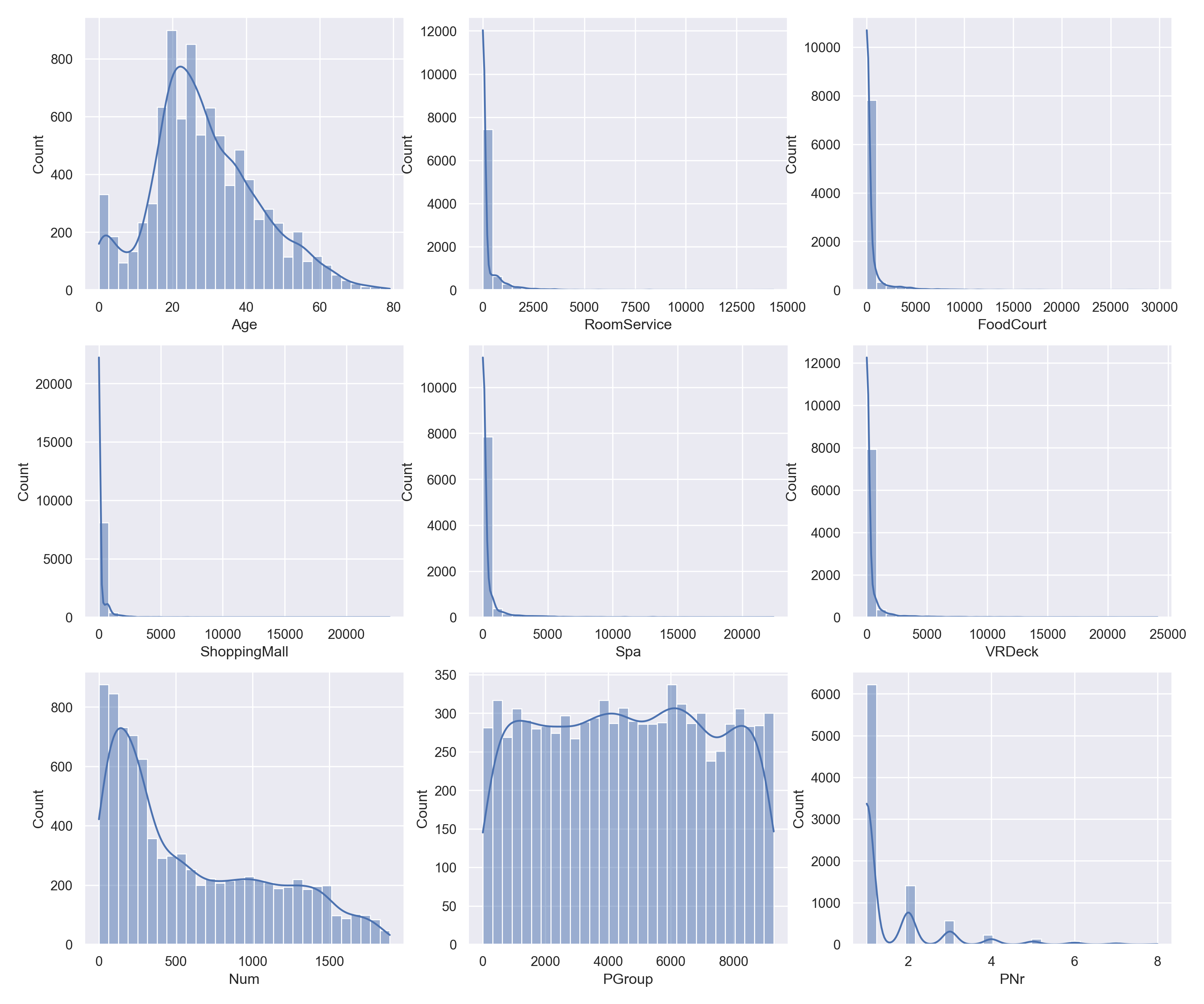 for column in ['Age', 'RoomService', 'FoodCourt', 'ShoppingMall', 'Spa', 'VRDeck', 'Num', 'PGroup', 'PNr']: