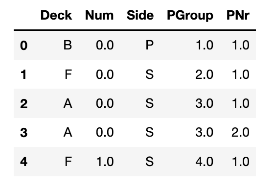 train_data[['Deck', 'Num', 'Side', 'PGroup','PNr']].head()