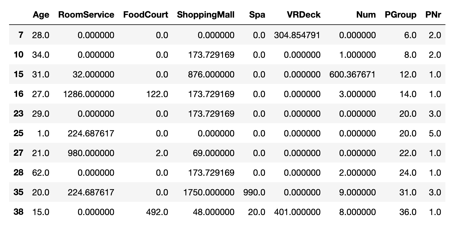 df_tmp = df[['Age', 'RoomService', 'FoodCourt', 'ShoppingMall', 'Spa', 'VRDeck', 'Num', 'PGroup', 'PNr']].copy()